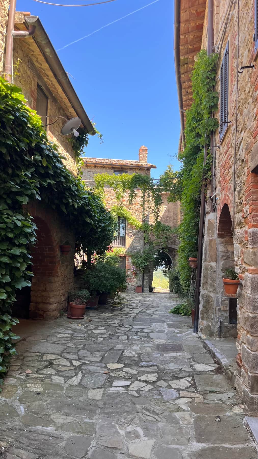 Der Blick von hier hat sich über die Jahrhunderte kaum verändert: im Westen liegt in einiger Entfernung der bewohnte Burg-Weiler Greppolieschetto, im Süden die Burg Montegiove. Nachbarn gibt es kilometerweit keine.